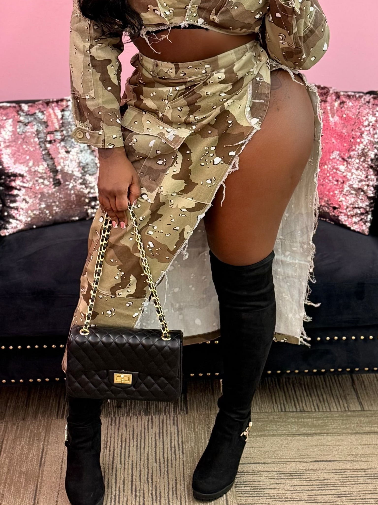 High waisted non stretch camo cargo style skirt. High slit. Fits true to size. Model is wearing a medium.