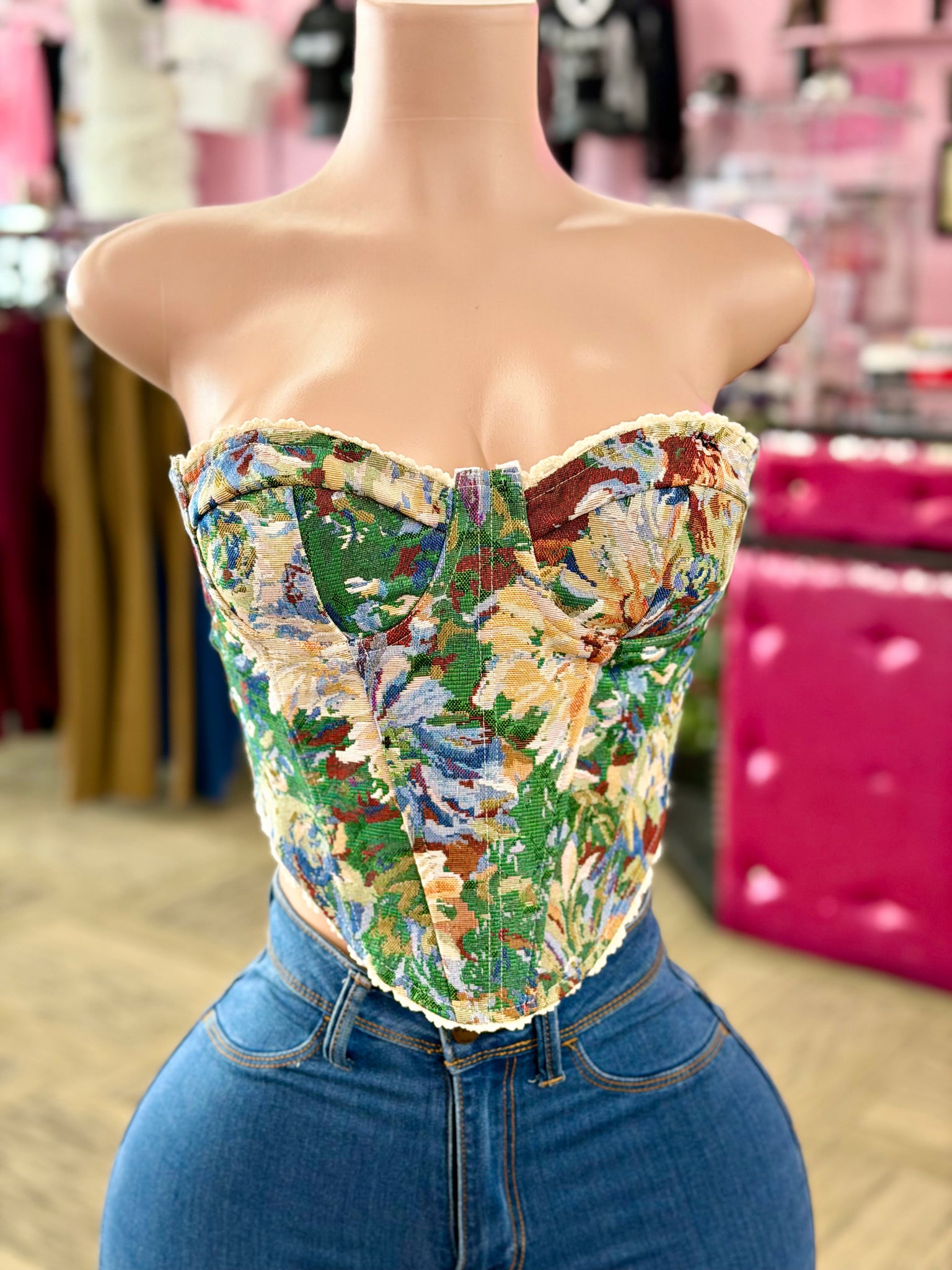 Sleeveless non stretch jacquard fabric corset. Fits true to size