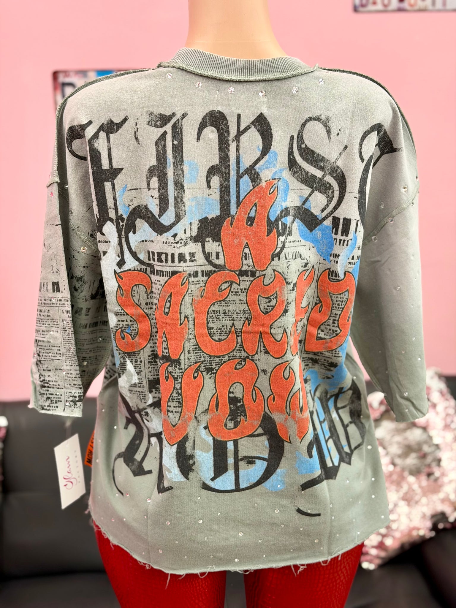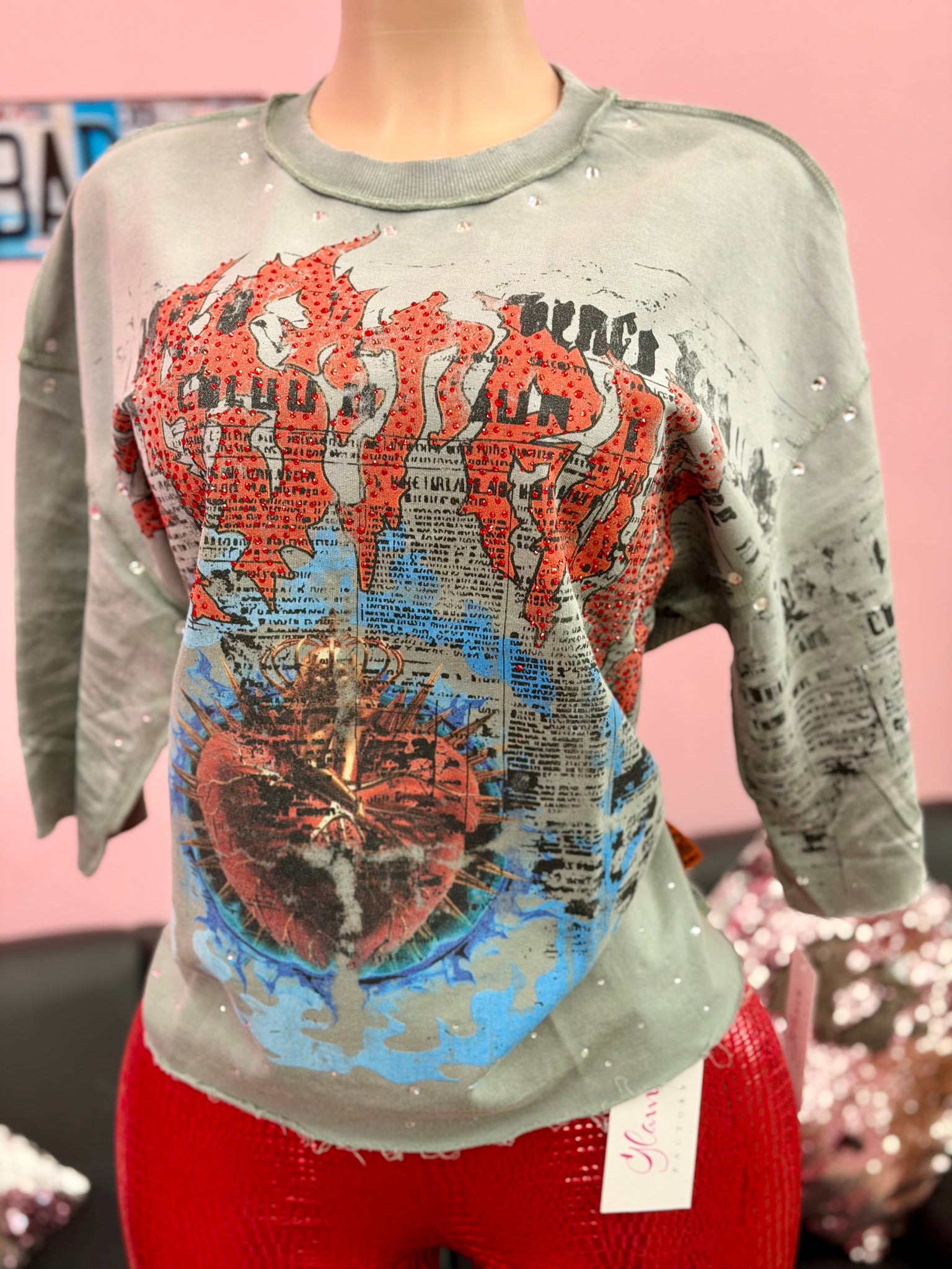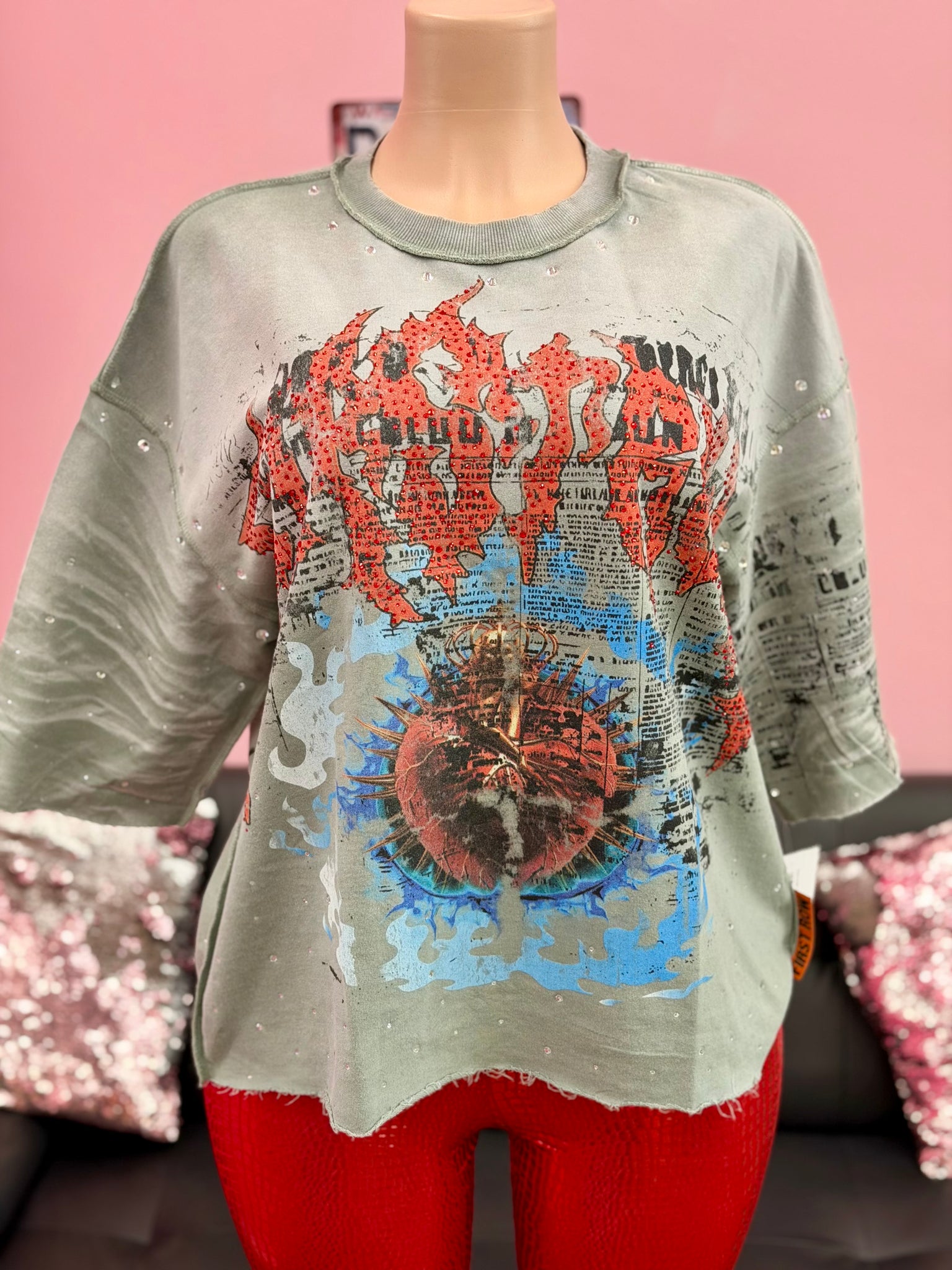 Cropped mini terry shirts featuring rhinestone detail, raw edge hem and ribbed neck. Oversized. Excellent fabric quality.