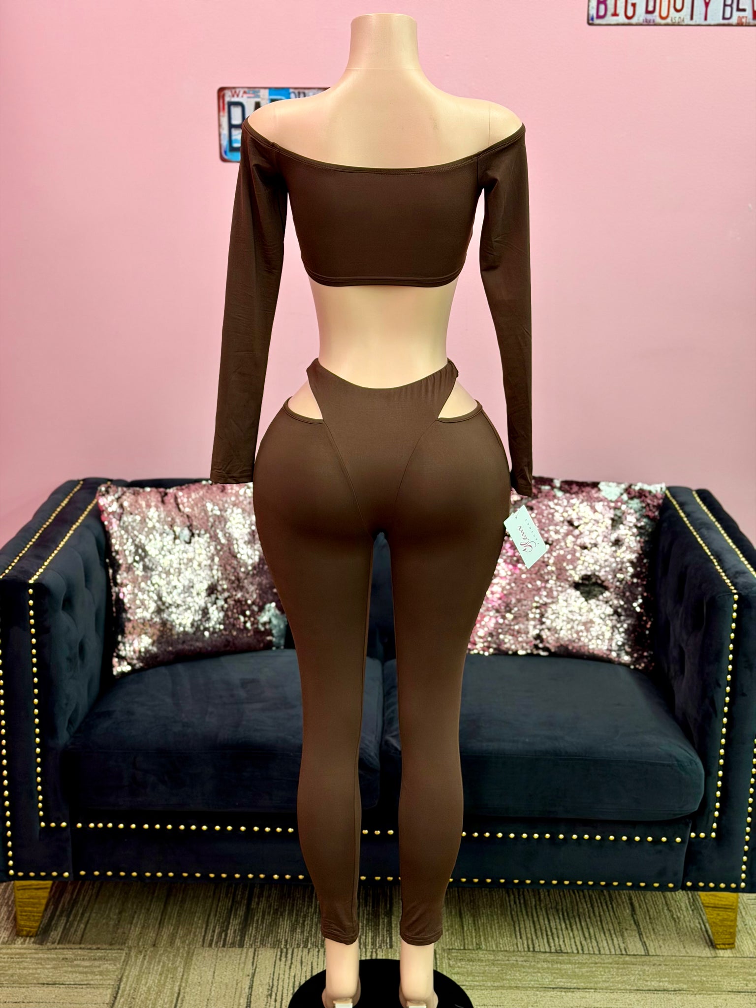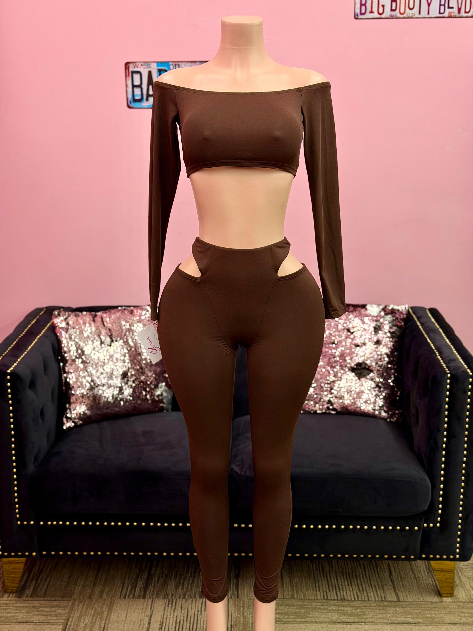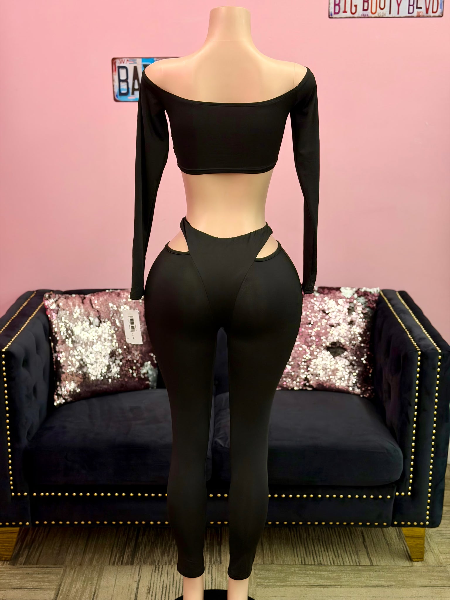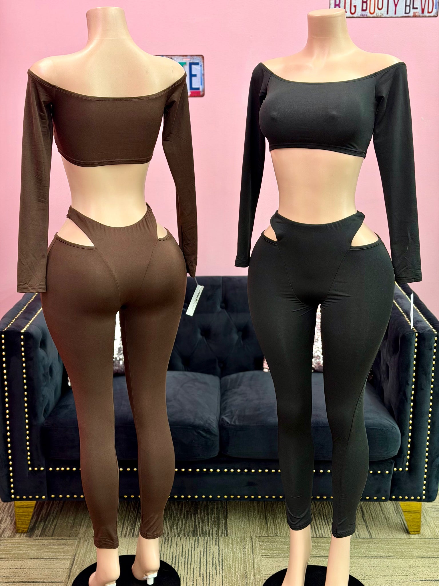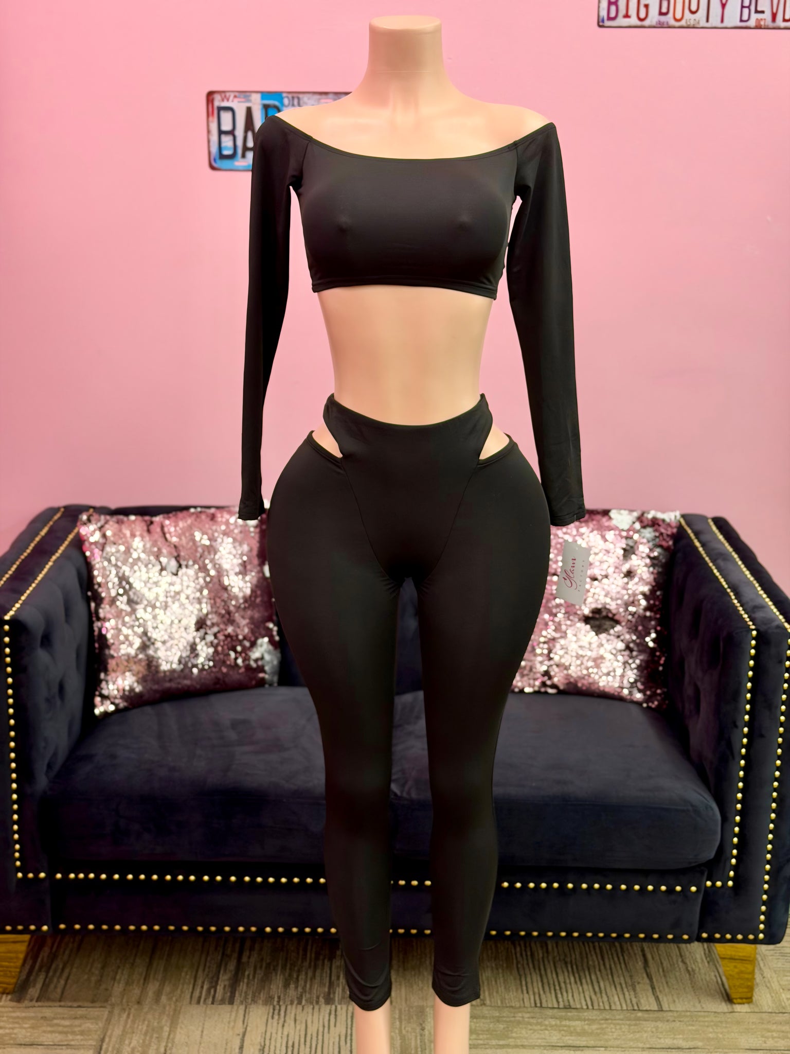 Off the shoulder top with matching cut out at the waist leggings. Stretchy fabric.